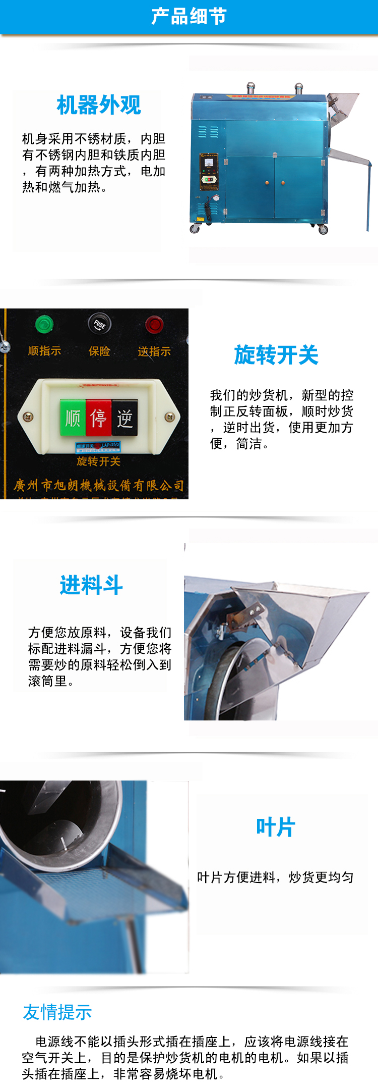 3.用气加热的炒货机配有节能灶头,可调节火力大小。用电加热的炒货机带有温控仪,可任意调节温度。